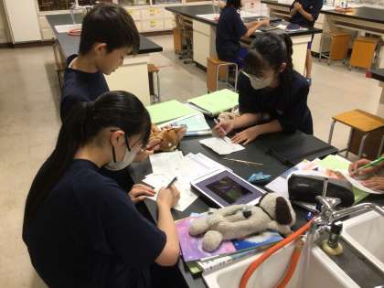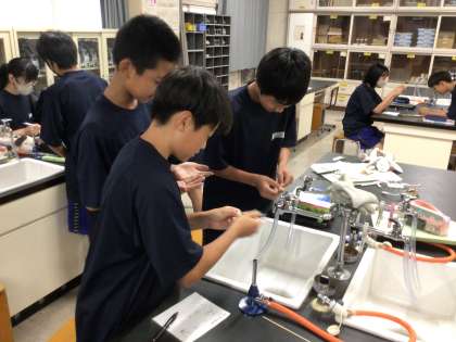 職員室までコンコンドンドンという音が聞こえてきたので行ってみると、1年生が理科の電気の実験・検証を行っていました。鉄線や銅線、シャープペンシルの芯などさまざまなものを叩いたり磨いたり、磁石に近づけたりして電気を通すか実験をしていました。結果の考察やまとめもして予想と比較しながら考えていました。