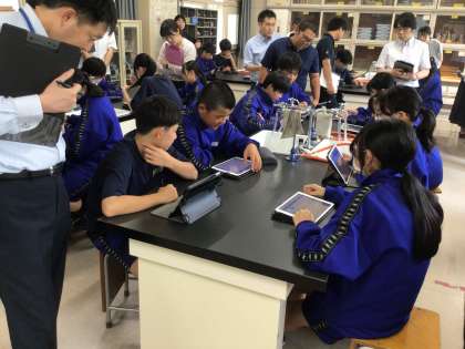 2年3組の理科の授業で校内授業研究会を行いました。酸素がかかわる化学反応について学習しました。理科の見方・考え方を養い、日常生活の事象を科学的に見ることができるように仮説を立てたり実験や考察をしたりして学びを深めました。