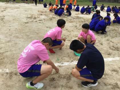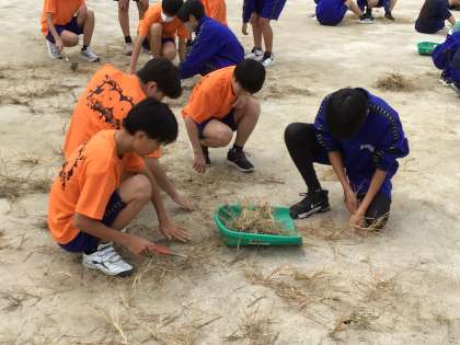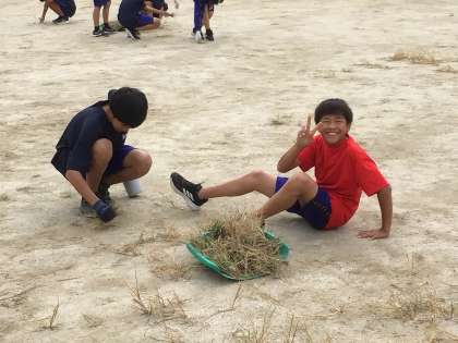 18日の体育祭に向けて、全校でグラウンドの草取りをしました。しっかりと根をはった草に苦戦しながらもたくさん取ることができました。