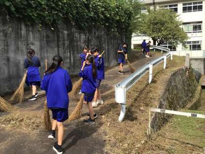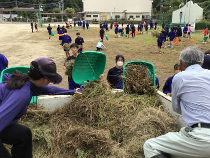 1年生から3年生まで全校生徒が愛校活動に取り組み、コンテナがいっぱいになるほどの草が集まりました。