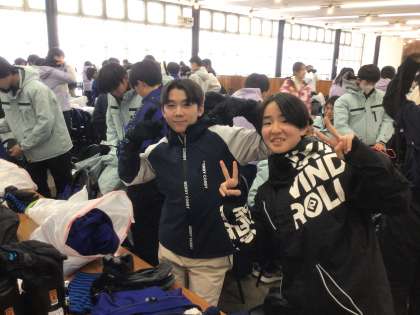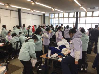 スキー研修の準備をしています。初めての人も質問しながら準備をしています。