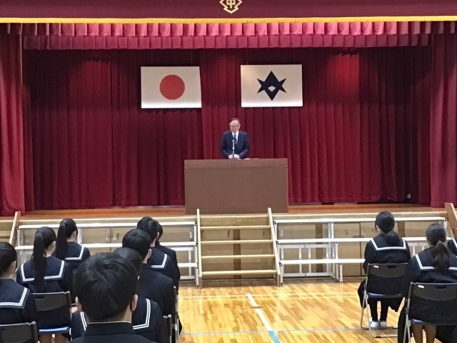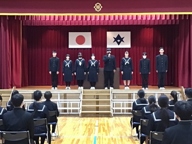 同窓会役員3名が来校され、令和7年度同窓会入会式を行いました。代表者が入会者誓いの言葉を述べ、学年・地区代表が紹介されました。役員の方と一緒に校歌も歌いました。