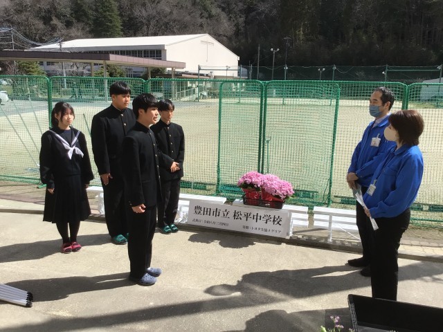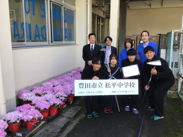 トヨタ生活協同組合様より、お花(サイネリア)50鉢、フラワースタンド4基、草取り鍬6本、プラ桶1個を寄贈いただきました。代表して生徒会長がお礼の気持ちを伝えました。寄贈いただいたお花は卒業式の会場に飾らせていただきます。