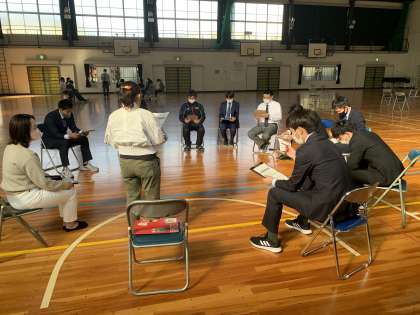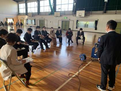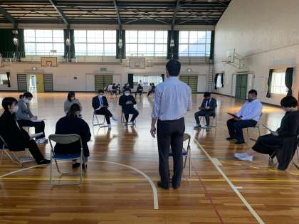 4月8日(金)、生徒の下校後、職員会議に続いて、体育館で教員の研修を行いました。1年間、「かかわり合いを通して、考えを深めることができる生徒の育成」をテーマに勉強し合っていきます。生徒たちが自分の考えを伝え合い、意見交流から新たな考えにたどりつき、理解がより深まる授業をしたいと考えています。そのために、生徒の話し合いのスキルアップ、教員の道徳および各教科の授業力アップを目指して教員が学び合っていきます。生徒が受け身ではなく、一生懸命考えて、「脳が汗をかく」授業を実現できるよう、頑張ります。