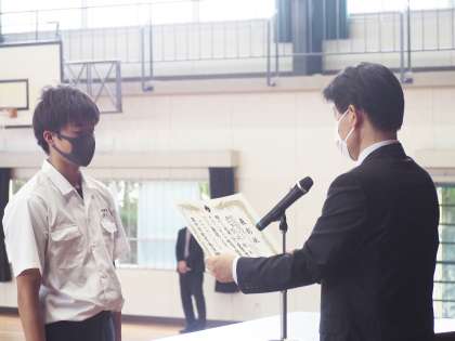 4月28日(木)6時間目に、3年生は体育館、1・2年生はリモートで会場とつなぎ、教室で認証式と意見発表に臨みました。最初に水泳の全国大会で優勝した笠江君の教育委員会表彰と、春季大会で3位入賞したソフトボール部の表彰伝達を行いました。認証式では、級長・議員・生活委員・正副委員長の認証を行いました。