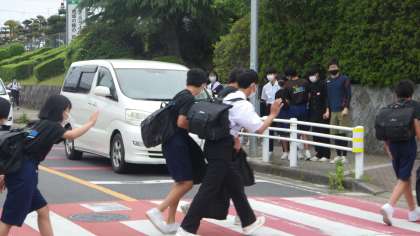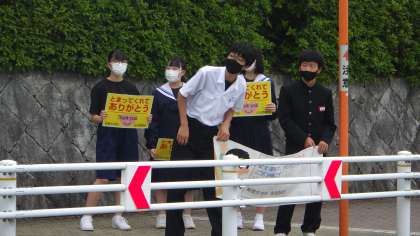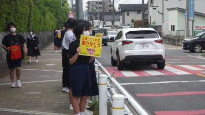 5月17日(火)、朝の登校時に、生活委員会が横断歩道近くに立って、「とまってくれてありがとう運動」の呼びかけをしました。大人の方々が、通勤で急いでいる中、美里中生の安全を優先して車をとめていただける。その思いにこたえ、車が止まったのをしっかり確認した後は、早めに横断し、会釈などで感謝の思いを伝える運動です。交通安全は、こういう心遣いから守られるのだと思います。今後も、一人一人が意識して行動にうつせるよう願っています。