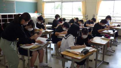 明日から中間テスト。テスト前日の今日は、各学年で、先生に質問したり、熱心にテスト勉強をしたりする姿が見られました。1年生の音楽では、十分に距離をとってマスクを付けたままで歌っている姿がありました。明日からのテスト、がんばってください。