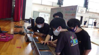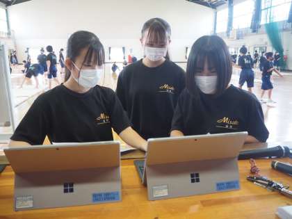 1・3年生は、体育でマット運動を行っています。3年生は、タブレットで模範の動画をみて、自分が行う技のポイントを確認しています。動画を活用することで、実際に演技を行う前に、自分の課題を見つけることができます。また、友達同士で録画しあい、自分の演技を振り返ることで、技の上達に生かしています。