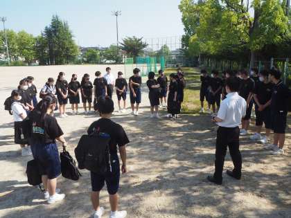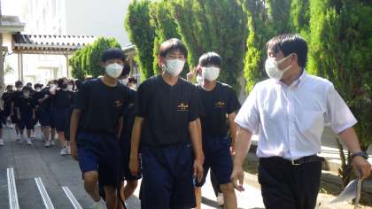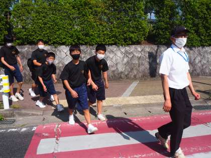 6月2日(木)、地区別会を行いました。「止まってくれてありがとう運動」を含めた交通マナーの確認や、地域の貢献活動についての話を聞きました。地区別会が終了後は、運動場に地区ごとで集合し、担当の先生と一緒に下校をしました。先生たちは、生徒たちと一緒に歩きながら、危険箇所がないか確認をしました。