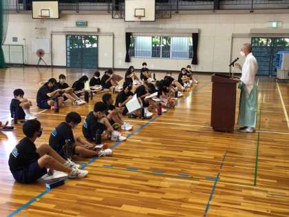 16日は、体育の授業に大学生ボランティアが参加しました。大学生は、積極的に生徒が声をかけてくれたことがうれしかったようです。また、6時間目には、1年生のひとクラスが地域講師を招いて学習しました。1年生は、総合的な学習の時間のテーマを「地域社会を知る」と設定しています。各クラスが知りたいことを決め、講師を招いて学習を進めていきます。16日は、野見神社の鈴木様を講師に迎え、野見地区の歴史や行事について学びました。また、お祭りで披露される巫女舞について教えていただきました。体育祭のダンスに取り入れたいという思いがあるようです。