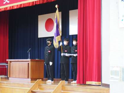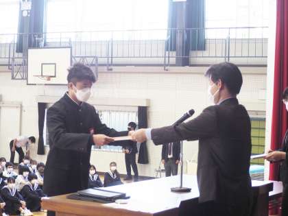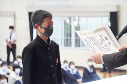 後期始業にあたり、全校集会を実施しました。久しぶりに、全校生徒が体育館に入りました。校旗登壇に続き、教育委員会表彰などの表彰伝達、生徒会役員、級長、議員、生活委員の認証を行いました。続いて、3年生代表生徒が意見発表を行いました。3年生として、後期の学校生活に臨む決意を、堂々とした語り口で全校生徒に伝えました。校長からは、お互いの声を届けて、つながりを紡ぐ活動を呼びかけました。「自分から、相手の目を見て、さわやかに」挨拶し、地域や仲間とのつながりを紡いでほしい。体育祭では、一人一人の糸を紡ぎ合って強い絆をつくり、相手の心の痛みを気遣いつつ、心地よいつながりを紡いでほしいと話しました。最後は、校歌。生徒会長が高らかに序章を暗唱し、3年生代表生徒のピアノ伴奏を聞きながら、心の中で校歌を歌いました。