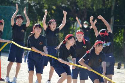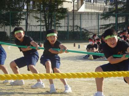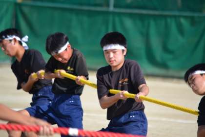 今日は、各学年で、4つまた綱引きの予選会が行われました。今回の予選を勝ち抜いたチームが、体育祭で対戦します。どの学年も力いっぱい競技に取り組み、精一杯クラスの仲間に声援をおくっていました。