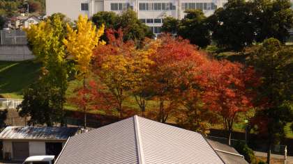 1・2年生が、音楽で箏の学習をします。今日は、1年生が取り組んでいました。今年は一人一面の箏を用意しています。校内の木々が美しく色づく季節に、箏の音色が心地よく響いています。