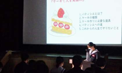 3年生は、総合的な学習の時間に、個人で探究活動を行ってきました。読書などの自分が興味のあるもの、つきたい職業など、自分でテーマを選んで調べ学習を行い、タブレットでプレゼンテーション資料を作成しました。プレゼン資料を作るうえでは、心理的に落ち着く色使いなどを意識しました。各クラスで生徒によって代表を決め、発表会でプレゼンテーションを行いました。環境問題、SDGs、色、YouTube、天体(宇宙関係)、世界中のディズニーランド(経営について)、卵が先か鶏が先か(日常の疑問は見方によってとらえ方は違う)など、テーマはさまざまでした。今回のプレゼンテーションは録画し、1・2年生にも披露する機会をつくりたいと考えています。