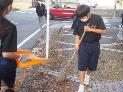 11月22日(火)、生徒会の呼びかけにこたえてくれた生徒たちが、朝の掃除を行いました。季節柄、落ち葉拾いを中心に、一生懸命活動してくれました。短時間でしたが、校内だけでなく、地域の方々が通られる道をきれいにしてくれました。また、1・2時間目にかけて、教育長が美里中を訪問されました。授業を参観され、放課の時間は生徒と交流されました。「成績を上げてください」と無理なお願いをする生徒もいましたが、笑顔で気さくにお話をしてくださいました。箏を学習している音楽の授業では、進んで教育長の指に付ける爪を選んでつけてくれたり、演奏の方法を教えてくれたりする生徒がいました。校内をまわられ、「美里の子は元気に挨拶してくれ、とても落ち着いて生活していますね」と、褒めてくださいました。