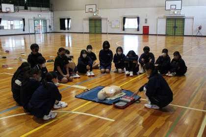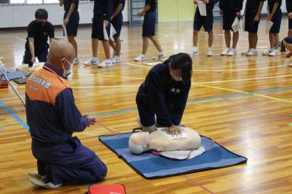 2年生が、体育の授業でAED講習を行いました。消防署員とインストラクターをお迎えし、体育館で行いました。