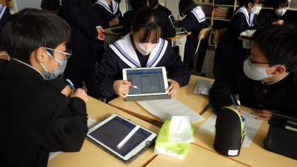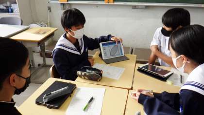 今日は、1年生のクラスで数学の研究授業を行いました。「習ったことを活用して、いろいろな図形の面積を予想し、説明しよう」という学習課題のもと、授業は進められました。グループごとに異なる課題が先生からタブレットに送信され、その画像に自分の考えを書き込んだり、図形を細かく色分けしたりして、各自で考え、グループで共有しました。話し合いのときには、「なるほど」「これってどういうこと?」と認め合い、聞き合っている姿が印象的で、ミサトーク(グループ討議練習)が生きているなと感じました。また、聞いて終わりではなく、他の子の説明を聞きながらメモを取る様子や、分からない点を詳しく説明してもらっている様子が見られました。次の時間は、グループを再編成し、グループごとで課題が違うので、それぞれの課題の解き方を説明し合うそうです。