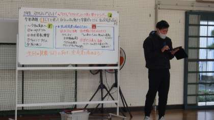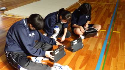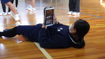 2年生のクラスで、体育の研究授業を行いました。「ICTを使って自分のからだの動きを客観的にとらえ、技の完成度を高めよう」という学習課題のもと、マット運動に取り組みました。タブレットにお手本動画が配布され、自分の動きと比較する準備をして活動が開始されました。小グループに分かれ、動画撮影や補助をし合いながら倒立前転などに挑戦しました。仲間と協働することで、技を決めるコツを教え合い、自分の課題を解決している姿が印象的でした。