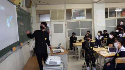 2年生のクラスで、理科の研究授業を行いました。放射線について各自で調べ、その性質を生かして利用されていることなどを発表し合いました。タブレットを活用し、資料をパワーポイントでまとめ、一人ずつ班で発表しました。そして、アドバイスカードを記入し、良い点や改善点を指摘し合いました。その後、代表3名がクラス全体の前で発表しました。相手を意識した発表の仕方に感心したり、放射線が農業に生かされていることに驚いたりする様子がみられました。
