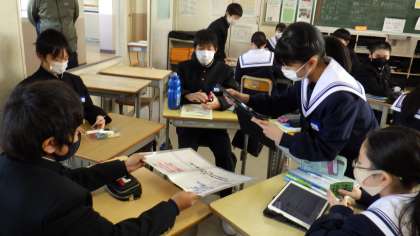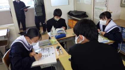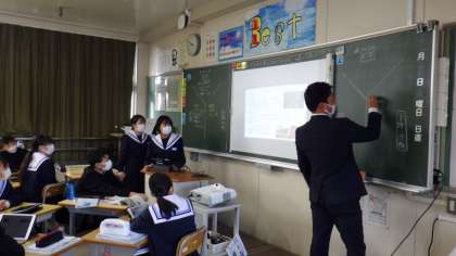 12月14日(水)、1年生のクラスで社会の研究授業を行いました。「北アメリカ州と南アメリカ州の生活文化の違いについて話し合おう」という学習課題のもと、生徒が活動しました。まずは、各班で班員が北アメリカと南アメリカに分かれ、事前にまとめた資料をタブレットで示しながら、発表し合いました。その後、学級全体で生活・民族・宗教や言語での違いを共有しました。次に、板書や自分たちが調べた内容をもとに、班で北アメリカと南アメリカの最も大きな違いは何かを考察し、ホワイトボードにまとめました。まとめた内容はタブレットのカメラで撮影して先生に提出し、それを大画面で示しながら、自分たちの気づきを伝えました。