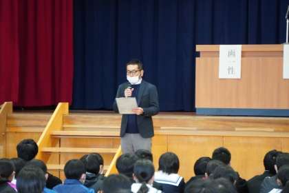 冬休み前の全校集会を行いました。最初に、トイレ工事を請け負ってくださった会社の代表に登壇していただき、感謝の言葉が詰まった生徒からのメッセージを贈りました。続いて、国際理解推進セミナー(市教委主催の海外派遣にかわる取組)に学校代表として参加した生徒が、全て英語で活動報告をしました。校長からは、多様性を認めることについて話をしました。「人との違いを受け入れるには、『言葉』『伝えること』『人とのつながり』が大切」「想いを言葉にしてつむぎ、船を受け入れる『みなと』のような優しい仲間が支えてくれると、多様性を認め合える環境が整う」と伝えました。校歌は、3年生生徒の伴奏を聞きながら心の中で歌い、生徒指導主事から冬休みの生活についての話と「メリークリスマス!」の言葉がありました。