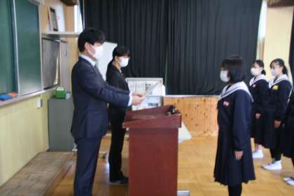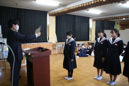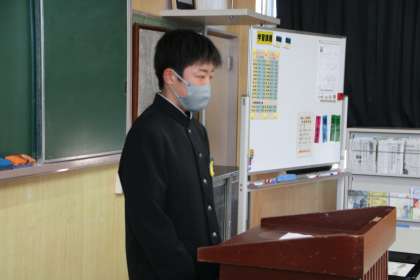 1月12日(木)、オンラインで意見発表と表彰伝達を行いました。まずは、2年生代表が、今まで頑張ってきたこと、今後、2年生全員で達成したいことなどを立派に発表しました。続いて、読書感想文入賞者の表彰、吹奏楽部・男女卓球部の表彰伝達を行いました。