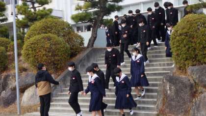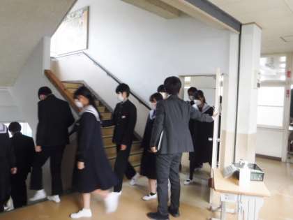 1月16日(月)の5時間目に、今年度2回目の避難訓練を実施しました。火災を想定しての訓練となりました。事前に担任から、「お(押さない)は(走らない)し(しゃべらない)も(戻らない)」の確認とともに、「もしものとき、命より大切なものはない。貴重品などを取りに戻ることがないように」と伝えられました。素早く避難した生徒たちは、担当者と校長から話を聞きました。
