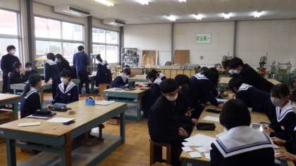 3年生の教室では、卒業アルバム用の授業風景が撮影されていました。また、総合の時間には、卒業プロジェクトに取り組み、奉仕活動などの担当ごとに分かれて準備を進めました。