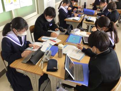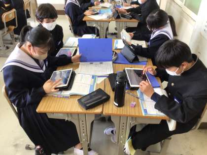 1年生の数学では、データの活用を行っています。スポーツテストの記録を、グループごとにタブレットを使ってまとめ、表やグラフにして分析しました。また、職場体験学習に関する学年集会を行い、6月の実施に向けて準備を進めています。