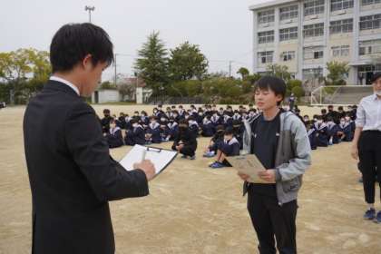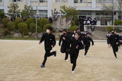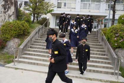 4月14日(金)、今年度初めての避難訓練を実施しました。地震が起きた想定で、まずは机の下で待機。その後、「安全確認をしたところ、一部階段が使用できない」との放送に従い、生徒は運動場に避難しました。