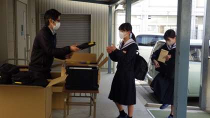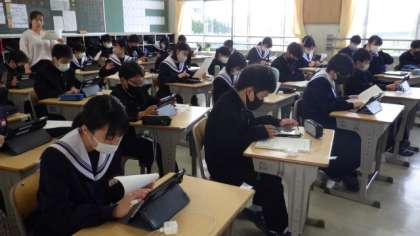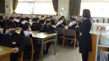 朝、登校時に、美術で使用するデザインセットの購入をしました。そして、朝の会では、中学校で使うタブレットの設定を個々で行いました。今後、授業などで大いに活用していきます。国語の授業では、図書館の利用について、司書とともに学びます。読書が好きな人は、今後、たくさん本を読んでください。
