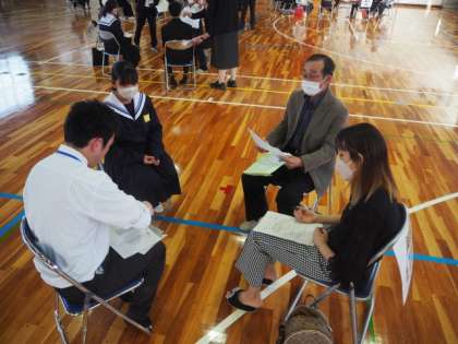 授業参観後に、育友会理事会を実施しました。数年前から役員・地区理事が参加して行う理事会をもって総会にかえることになっています。真摯なご審議、ありがとうございました。総会に続き、区長さんをお招きし、育友会の地区理事と地区の代表生徒、地区担当教員で顔合わせ会を行いました。昨年度から、お互いの顔を見ながら、今後の予定などについて話す機会を設けています。ご多用の中、お越しくださった皆さん、ありがとうございました。