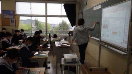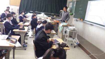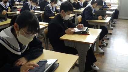 3年生は、朝の帯学習で、今後行うミサトーク(話し合い活動)の準備として、与えられた課題について、タブレットを使って各生徒が意見をまとめ、班で共有していました。1年生の国語の授業では、司書と学んだ図書館の利用法について、生徒がタブレットを活用してクイズに答える形で復習していました。2年生の英語の授業では、授業の振り返りを毎回タブレットに保存しているシートに記入しています。