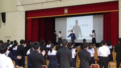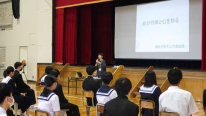 5月2日(火)、3年生が体育館で「思春期教室」に臨みました、市役所のこども家庭課から講師をお招きし、「自分の体と心を知る」というテーマで貴重なお話を聞きました。