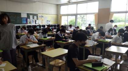 3年生の数学は、クラスを二つに分けて少人数で授業を行っています。また、3年生の英語は各クラス2時間ずつ、2年生の英語は各クラス1時間ずつ、1年生の数学は各クラス2時間ずつ、2名の先生で授業を行う「TT」を実施しています。個別の生徒に対応して支援する時間を大切にしています。