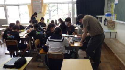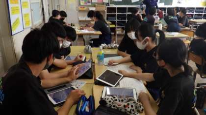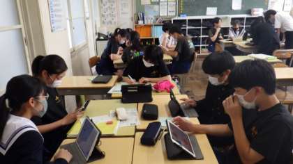 3年生の教室では、班別研修の目的地探しをしていました。タブレットを活用していますが、画面をのぞくと食べ物の映像ばかりのような気が・・・。昼食場所を決めることも、班別研修の大切なテーマになっているようです。