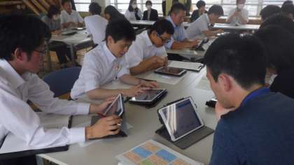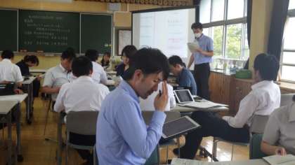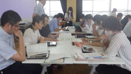 国語の指導訪問をうけ、指導員の先生とともに、本校の先生たちが研究協議会を行いました。ここでもタブレットでKJ法を行い、発表し合いました。指導員から学んだことを、今後の授業に生かしていきます。