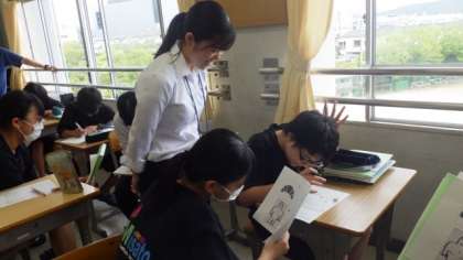 1年生のクラスで、実習生が授業を行いました。本校の指導担当教諭と一緒に指導案作りや準備を重ね、授業に臨みました。3週間ともに過ごしてきた教育実習生に応えようと、生徒たちは一生懸命授業に取り組んでいました。