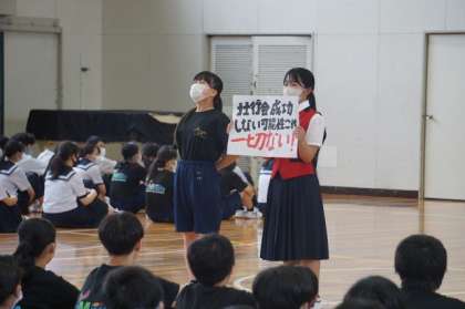 数年ぶりに、本格的な壮行会がかえってきました。入場行進から始まり、各部が舞台に上がり、夏の大会に向けての決意表明を行いました。続いて、部ごとに1・2年生からエールがおくられ、その後、1・2年生全員で心のこもった3年生へのエールを。体育館が揺れるのを久しぶりに感じました。選手宣誓では、3年生全員の熱い思いが伝わりました。校長からは、「『みんなで前へ 〜標を掲げ、誇りを胸に〜 』という年度当初に示した目標を、大会やコンクールで実践してほしいこと」、「あなたを一番大切に思っている人たちのためにも最高の試合・演奏を」と、願いを伝えました。