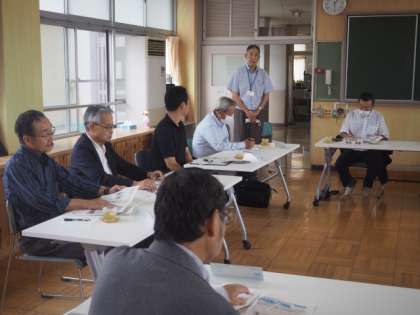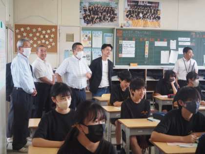 毎年開催している「区長さんとの情報交換会」を、6月23日(金)に行いました。まずは授業参観で、生徒たちの様子を見ていただき、特別支援学級の八賀喜屋に寄ってもらいました。その後、学校の近況報告をし、区長さんから地域活動への生徒の参加などについて質問や意見が出されました。また、今年度モデル実施している校内はあとラウンジ『憩い♡ホッとルーム』のマネージャーと、本校を拠点校として活動しているスクールソーシャルワーカーを区長さんに紹介し、新たな取組を説明しました。