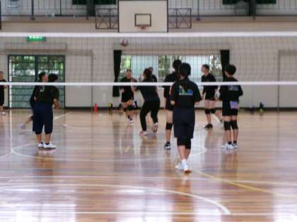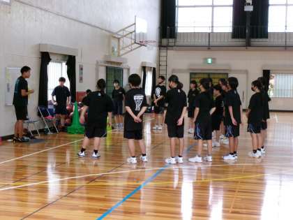 8月7日の体育館の割り当ては、女子バスケットボール部とバレーボール部で、二つの部が元気に活動していました。男子バスケットボール部は、トレーニング後に教室で学習をしたり、顧問の先生の話を聞いたりしている様子がみられました。吹奏楽部は、県大会が終了し、1・2年生の部活動が始まっています。