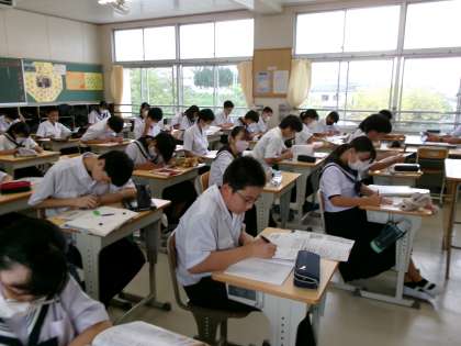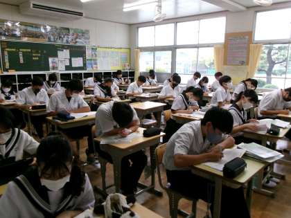 9月6日から、前期期末テストが行われています。朝の会後30分間は、各自自席で自習をします。これは、最後の学習チェックと給食までの時間調整のためです。どの学年も静かに取り組んでいました。