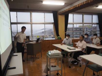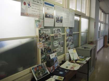 生徒下校後、教員研修を行いました。最初に、「韓国への日本教職員派遣プログラム」に参加した先生の報告会を行いました。職員室前にこのプログラムでの資料や写真が掲示してあります。興味のある人は手に取ってみてください。その後、教科ごとに分かれて授業の持ち方などについて意見交換をしました。
