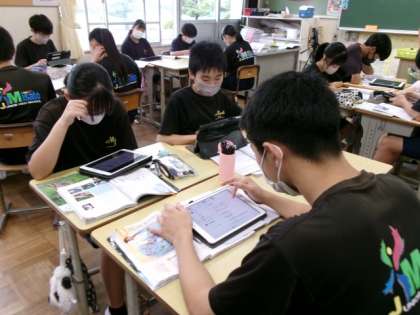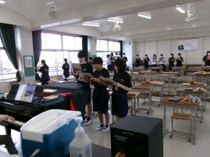 3年生の教室をのぞくと、理科でTeamsの投稿機能やスカイメニューの気づきノートを活用して、資料を見て気づいた点について意見交流をしていました。英語では、一人ずつ英語スピーチをしていました。音楽では歌のテストが行われおり、感染対策のため、練習は窓を開けて外に向かって声を出すなどの工夫をしていました。