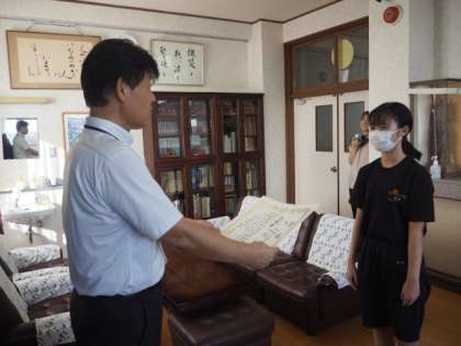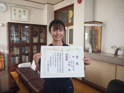 2年生の中村さんが、島根県で行われた「令和5年度 安来節全国優勝大会」に出場し、「唄 少年三段の部」で準優勝という素晴らしい成績をおさめました。校長室に来て、報告をするとともに、先生たちからの質問に対して丁寧に答えてくれました。小学生の頃から努力を重ね、輝かしい活躍をしている仲間は、たいへん誇らしいですね。今後のさらなる活躍を期待しています。