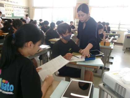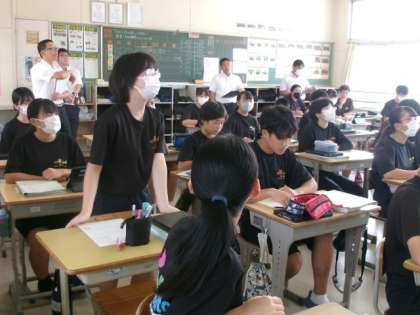 1年生のクラスで数学の研究授業を行いました。「具体的な場面で方程式・比例式を活用する」単元での授業です。今日は、「比の関係に着目して、分量を変えても同じ割合にできるか考えよう」という学習課題のもと、授業が進められました。協働して課題解決する場面では、ペアで説明し合ったり困ったことを聞いたりする時間を設け、熱心に話し合っていました。また、ICT機器を使って生徒の考えた関係図をホワイトボードに映し出し、全体交流することで、量の変化が可視化され、生徒がイメージしやすくなる工夫がされていました。