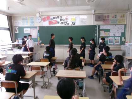 1年生の教室では、前期の振り返りが行われていました。プリントに、自分の前期の取り組みを思い返しながら記入していました。あるクラスでは、同じ役割を任された前期・後期のそれぞれの生徒が向かい合って、ねぎらいのメッセージや後期に頑張ることなどを伝え合っていました。