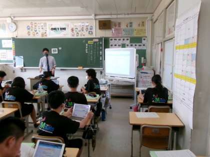 1年生の英語では、ALTを相手にパフォーマンステストを行っていました。自分の好きなことを紹介するため、タブレットでお気に入りのアニメやゲームなどを示しながら英語で伝えていました。1年生の国語では、「聞き上手になろう」という学習課題のもと、示された文章を読んで感じたことを、「スカイメニューの気づきメモ」に各自が打ち込んでクラスで共有していました。2年生の理科は、イカの解剖に取り組んでいました。解剖して取り出した器官をタブレットで撮影し、発表ノートに貼り付けてまとめに活用したり、教科書に載っていない細かな器官の名称や働きをタブレットで調べたりしていました。ニオイなどが苦手で実物を見られない生徒の観察用としても、タブレットで撮影した映像が生かされていました。