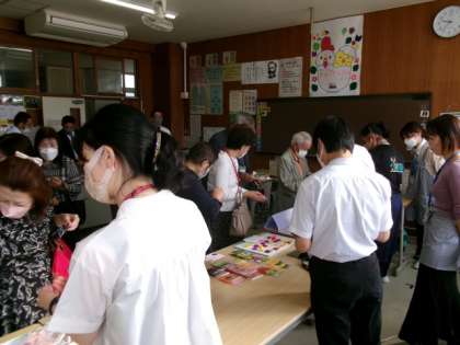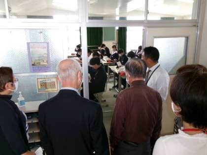 11月6日(月)、美里地区の民生・児童委員のうち20名が来校され、教職員との情報交換や授業参観をしました。授業参観の最初には、特別支援学級の八賀喜屋(生徒作成物の販売)に寄っていただきました。その後、各フロアを回り、ICT機器を活用した授業やTT・少人数授業などの様子を興味深そうにご覧になっていました。お越しになった皆様の中には本校の卒業生や元保護者の方がいらっしゃり、校舎内外の様子をなつかしんでおられました。情報交換時には、地域行事で美里中生がボランティアとして活躍していることや、交通安全に関することなどが話題にあがりました。