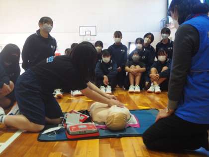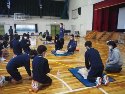 2年生が心肺蘇生について、講師を招いて学びました。人体模型を使って、心臓マッサージをしたり、AEDを装着して起動したりしました。